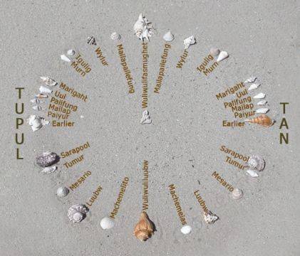 波利尼西亚航海家 Mau Piailug(公元 1932 年至 2010 年)的星罗盘再现,描绘了沙上的贝壳和萨塔瓦尔语(加罗林群岛)文字标签,由波利尼西亚航海协会描述。/维基共享资源