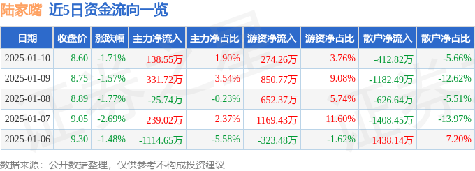 1月10日的资金流向数据方面,主力资金净流入138.55万元,占总成交额1.9%,游资资金净流入274.26万元,占总成交额3.76%,散户资金净流出412.82万元,占总成交额5.66%。